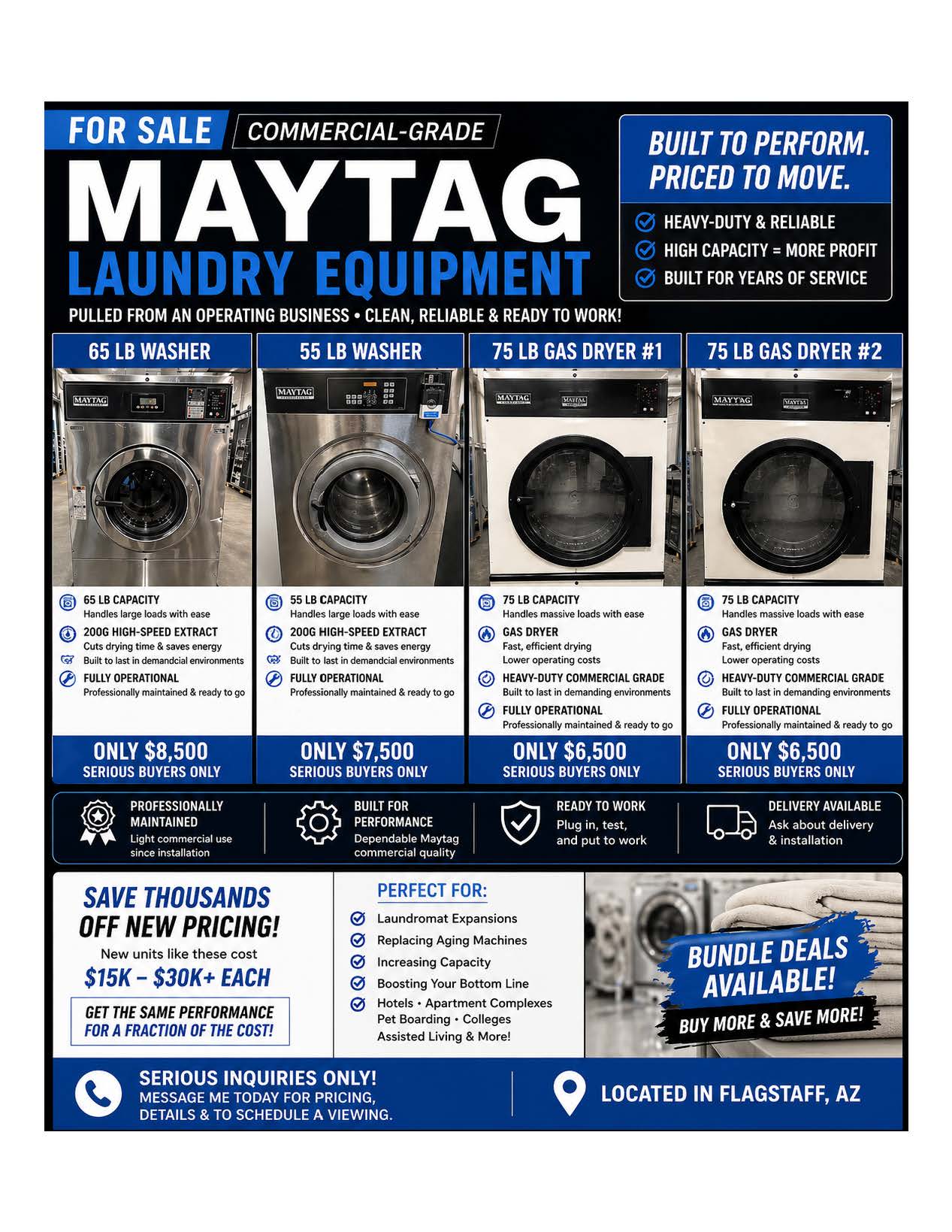 These are ideal for laundromat owners looking to increase revenue, replace aging machines, or expand capacity.